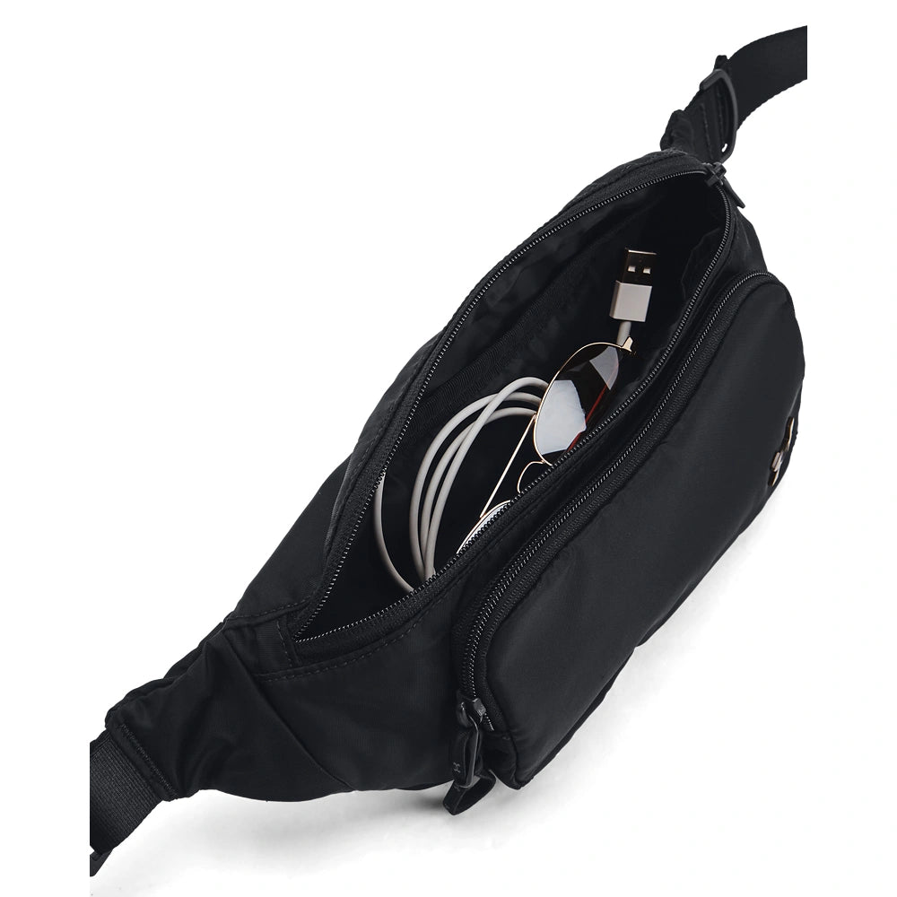 - Adjustable strap with buckle closure can be worn as a waist bag or a crossbody